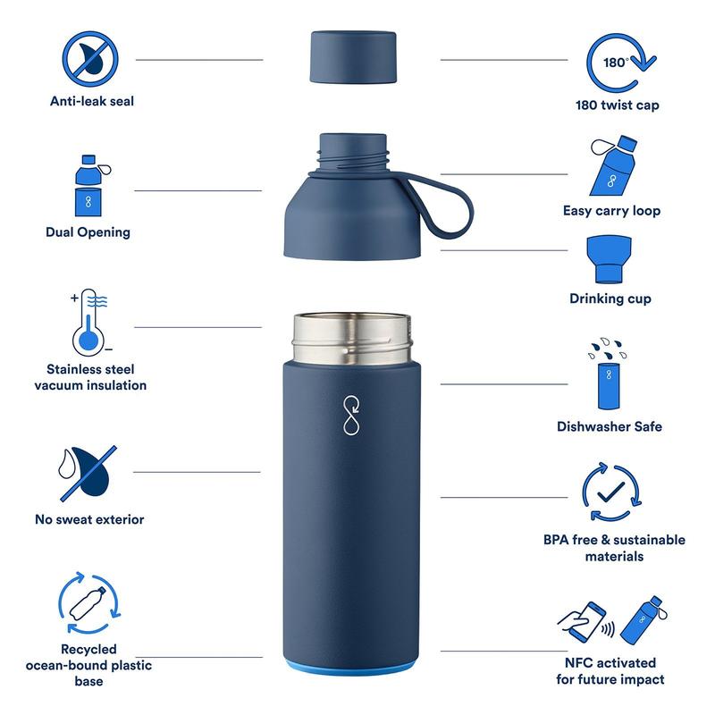 - About the Ocean Bottle – 500ml, dishwasher safe, 10-year warranty, 100% recycled & recyclable packaging.
