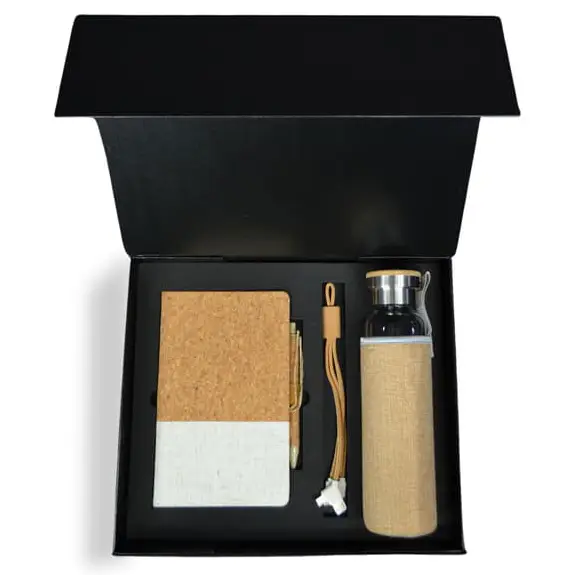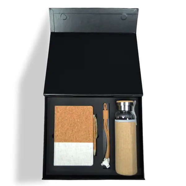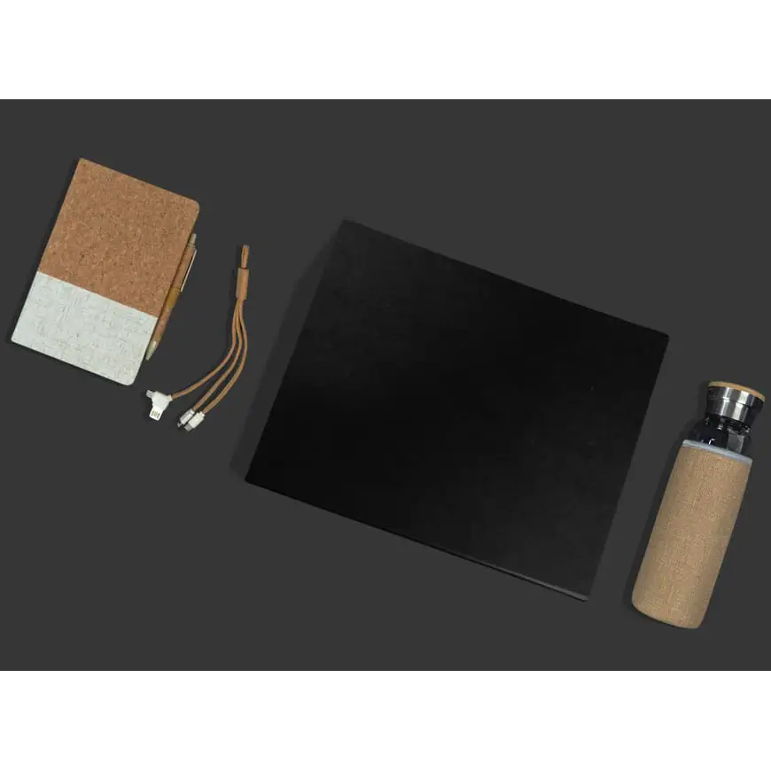 Gift set containing cork fabric cover notebook, 5-in-1 multicable, borosilicate glass bottle.