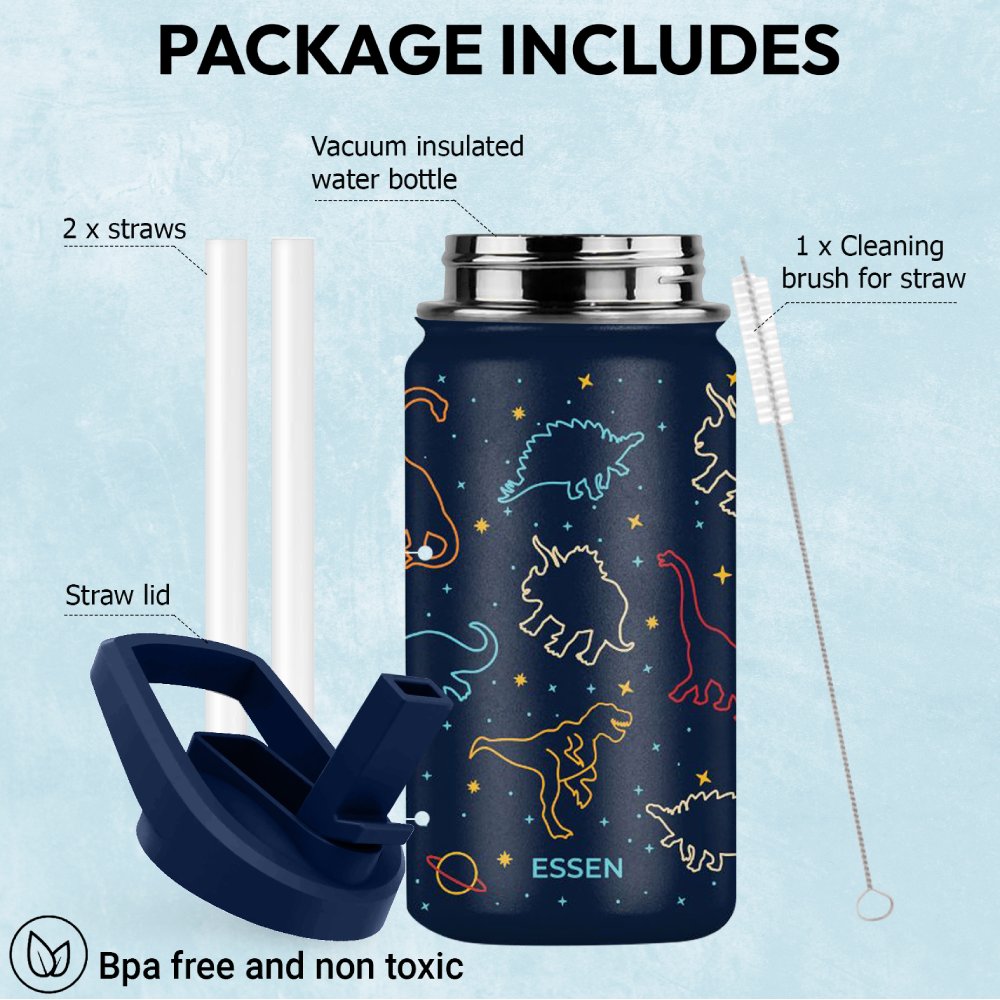 • PREMIUM 18/8 STAINLESS STEEL: Are you worried about choosing one safe water bottle for your child? ESSEN 414ml Kids’ water bottles are made of high-quality 18/8 stainless steel, BPA-free, 100% non-toxic, and odorless. The wide-mouth design makes cleaning a breeze, which is always a win for busy parents!