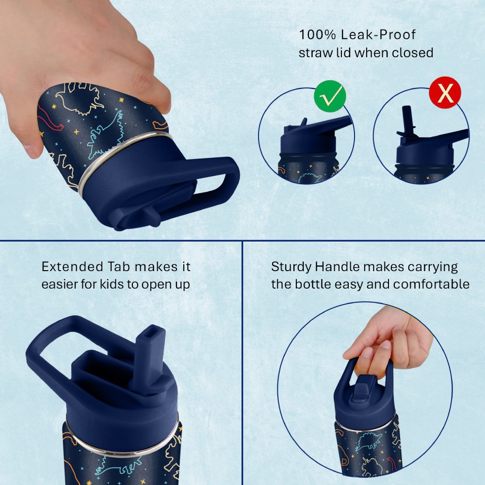 • 100% LEAK-PROOF STRAW LID: Our straw lid is leak-proof when in the closed position. The sturdy handle, sweat-free design, and leak-proof straw lid make it easy for kids to take the water bottle and confidently carry it in their bag without worrying about messy accidents! Hand wash only with soapy water.
