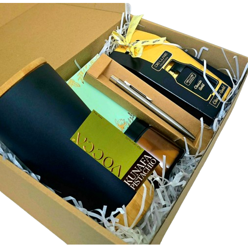 Gift Hamper with Vocca Kunafa Chocolate, Pistachio Baklava, Bamboo Stainless Tumbler, Soywax Oud Candle, Steel Pen and Perfume