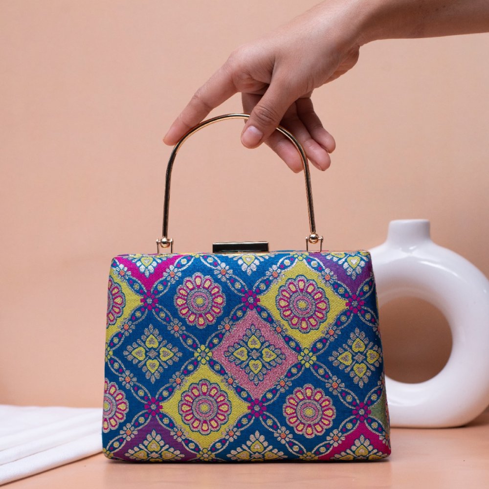 Square Design Blue Colour Brocade Fabric Clutch Bag